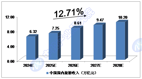 我们预计,2024年我国国内旅游收入将达到6.32万亿元,未来五年(2024-2028)年均复合增长率约为12.71%,2028年将达到10.20万亿元。