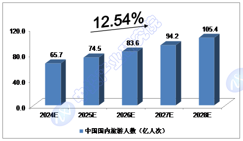 我们预计,2024年我国国内旅游人数将达到65.7亿人次,未来五年(2024-2028)年均复合增长率约为12.54%,2028年将达到105.4亿人次。