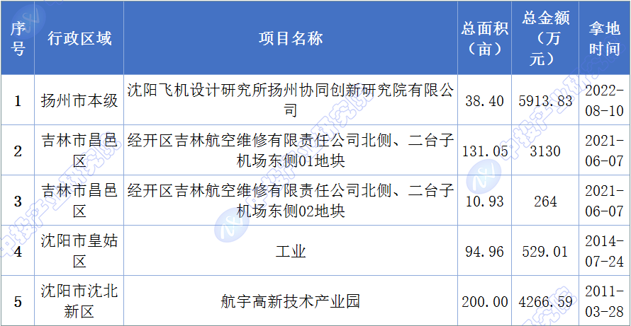 图表:截至2024年中航沈飞股份有限公司拿地明细表