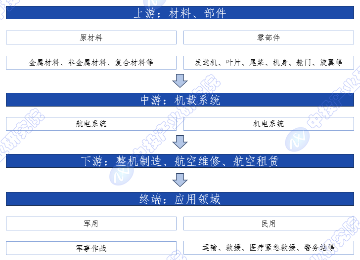 直升机行业的产业链按照直升机生产制造顺序,直升机产业链可分为原材料、零部件、子系统、整机以及维修检测五部分。其中子系统包括动力系统、飞行设备、传动系统、通信导航系统以及旋翼系统等。