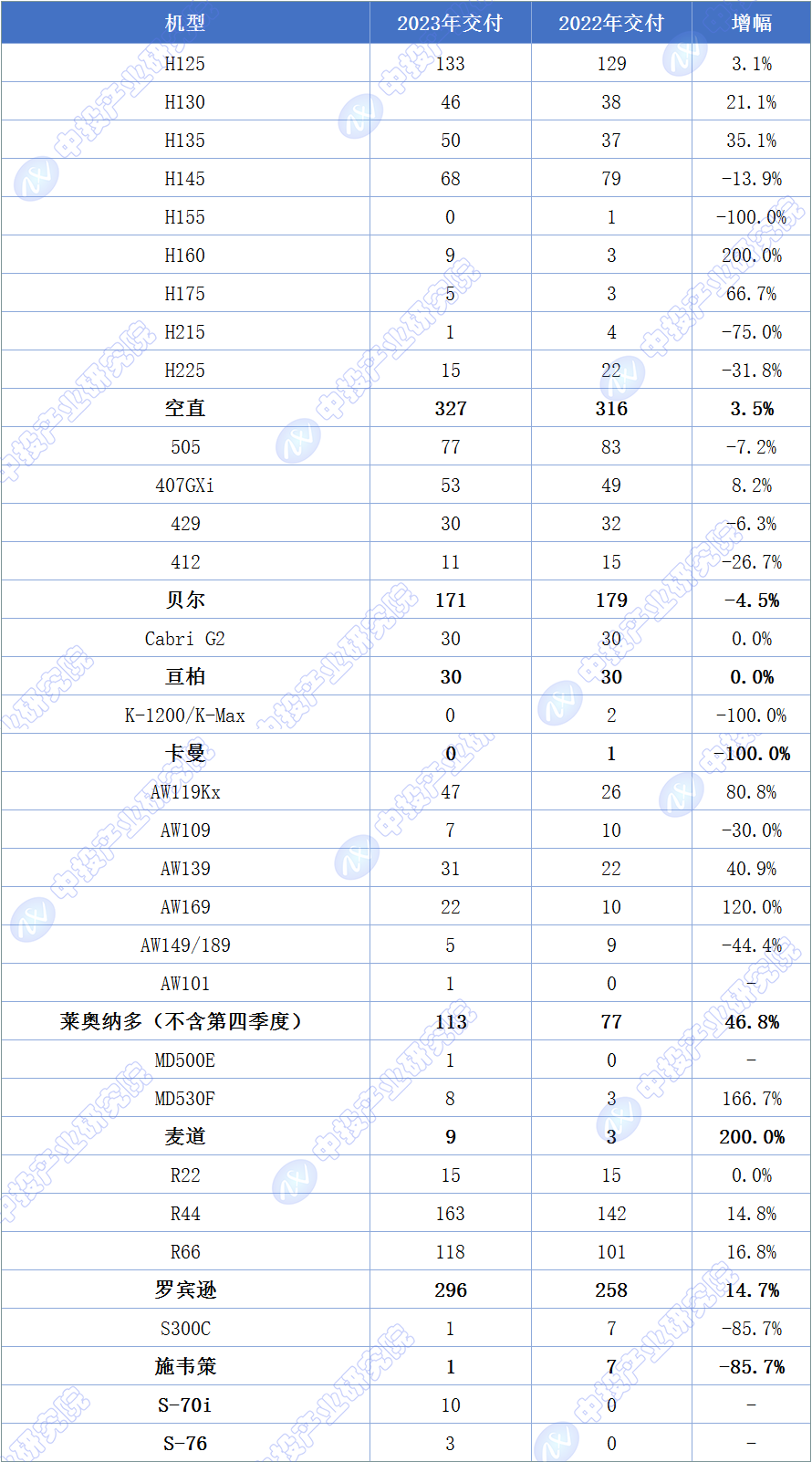 中投产业研究院发布的《2024-2028年中国低空经济深度调研及投资前景预测报告》指出,2023年,全球民用直升机年度交付数量为963架,比2022年度增长9.8%;交付产品总产值为44.01亿美元,比2022年度增长11.2%,市场持续复苏。制造商方面,空客直升机公司仍然牢牢占据市场榜首位置,交付量占市场总量32.8%,产值占47.6%。其余几大制造商分别为莱昂纳多、贝尔、罗宾逊、西科斯基。以上5家制造商垄断了全球市场95.86%的产量和99.09%的产值。