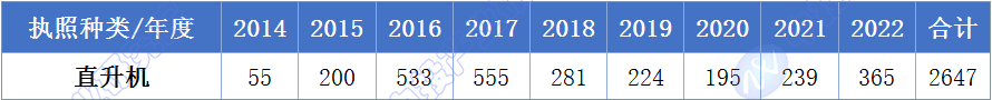 图表:2014-2022年中国直升机驾驶员执照数量统计