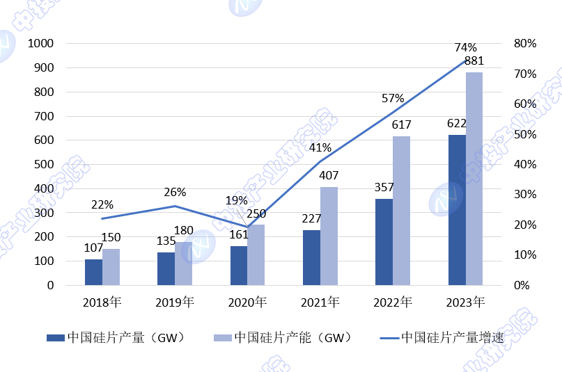 2023年中国光伏硅片产量达到622GW,增速为74%,出口量为70.3GW,同比增长超过93.6%。这些数据反映了中国光伏硅片行业的强劲增长势头。