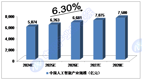 我们预计,2024年我国人工智能产业规模将达到5,874亿元,未来五年(2024-2028)年均复合增长率约为6.30%,2028年将达到7,500亿元。