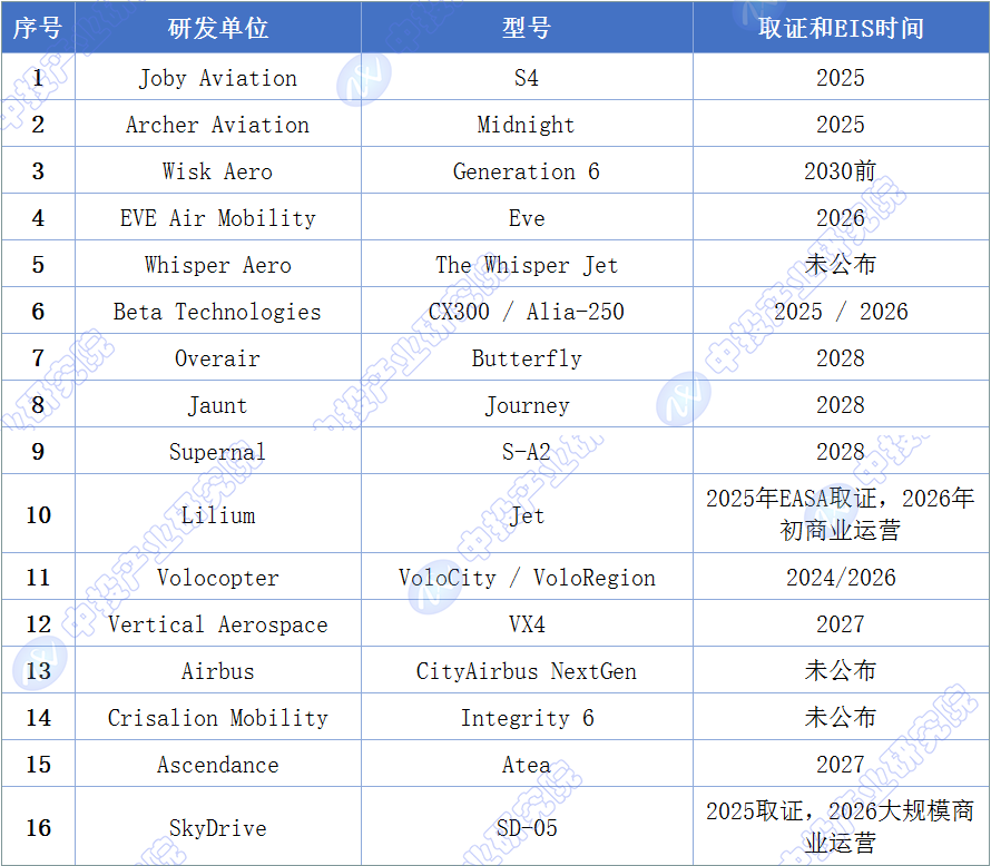 图表:国外主要头部企业eVTOL机型的EIS时间