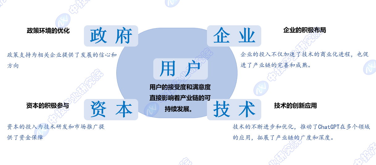 ChatGPT产业链的发展是一个多方面因素共同作用的结果,以下是运用半岛网站手机登录 原创的五要素模型,从政策、资本、技术、企业和用户五个角度对ChatGPT产业链发展驱动因素的详细分析: