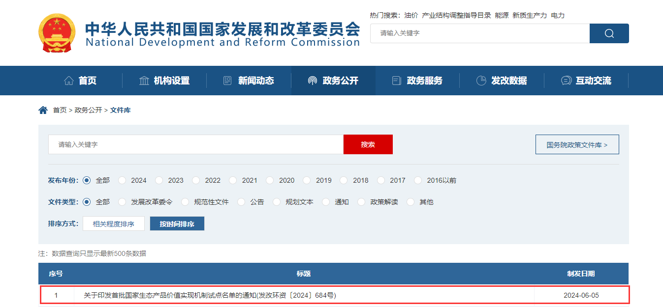 2024年6月5日,国家发展改革委印发了首批国家生态产品价值实现机制试点名单。