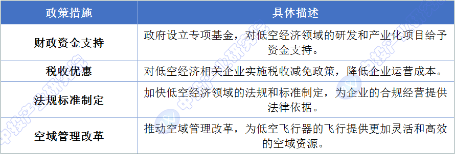 政策支持是推动低空经济发展的关键因素,具体措施包括: