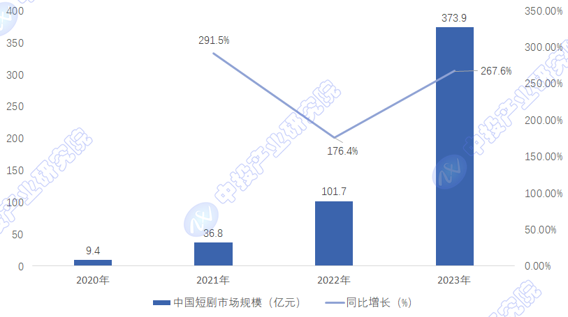 中投产业研究院发布的《2024-2028年中国多晶硅产业投资分析及前景预测报告》显示,2022年中国微短剧市场规模达101.7亿元,同比上升176.4亿元;2023年中国微短剧市场规模达373.9亿元,同比上升267.65%。