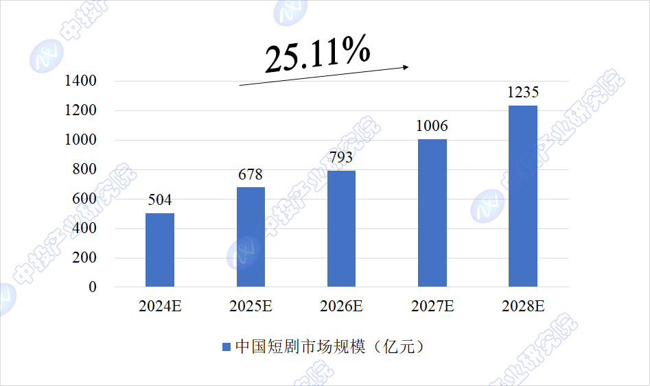 中投产业研究院预计,2024年我国短剧市场规模将达到504亿元,未来五年(2024-2028)年均复合增长率约为25.11%,2028年将达到1235亿元。