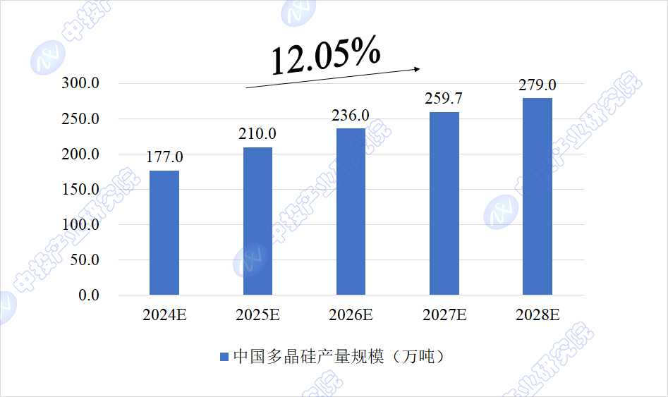 中投产业研究院预计,2024年我国多晶硅产量规模将达到177万吨,未来五年(2024-2028)年均复合增长率约为12.05%,2028年将达到279万吨。