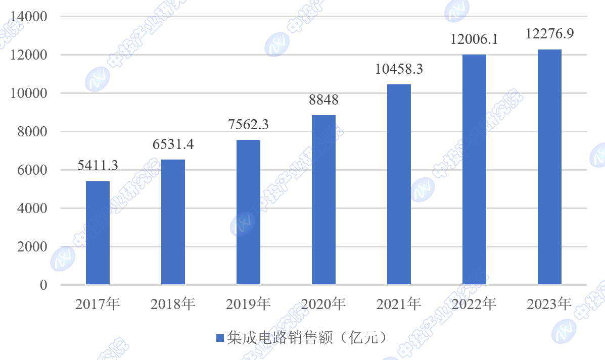 2022年中国集成电路市场销售额达到了12006.1亿元人民币,同比增长14.8%。根据世界半导体贸易统计组织(WSTS)数据,2023年中国集成电路产业销售额12276.9亿元,同比增长2.3%。