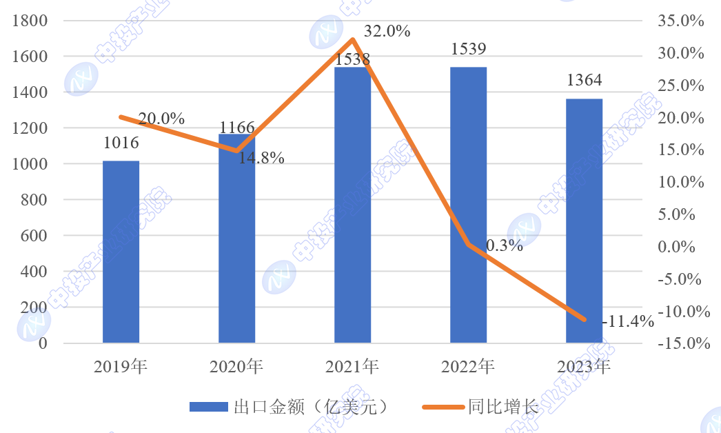 图表:2019-2023年我国集成电路出口金额情况