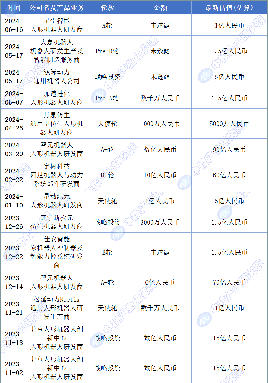 图表:2023-2024年中国人形机器人行业投融资事件汇总
