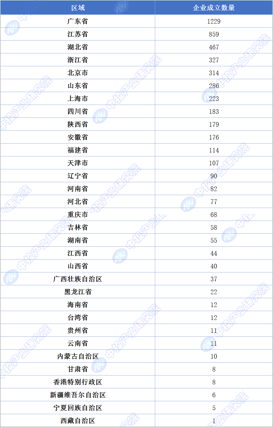 从数据来看,广东省以1229家企业成立数量遥遥领先,是激光器企业分布最为集中的地区。江苏、湖北、浙江、北京、山东等地也拥有较多的激光器企业。