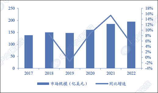 2022年全球激光器市场规模超190亿美元。根据Laser Focus World数据,全球激光器市场规模从2017年的137.7亿美元增长至2022年的194.2亿美元,CAGR为7.12%。