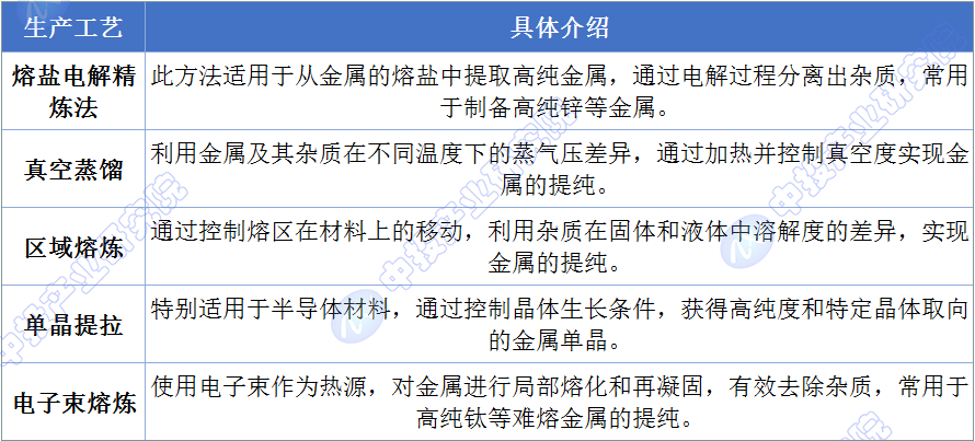 高纯金属的生产工艺是确保其高纯度特性的关键。目前,行业内主要采用以下几种生产工艺: