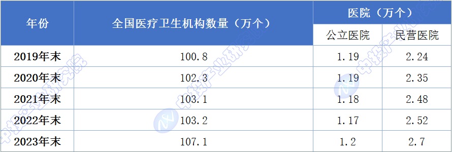 2023年年末全国共有医疗卫生机构107.1万个,其中医院3.9万个,在医院中有公立医院1.2万个,民营医院2.7万个;基层医疗卫生机构101.6万个,其中乡镇卫生院3.4万个,社区卫生服务中心(站)3.7万个,门诊部(所)36.2万个,村卫生室58.3万个;专业公共卫生机构1.2万个,其中疾病预防控制中心3426个,卫生监督所(中心)2791个。卫生技术人员1247万人,其中执业医师和执业助理医师478万人,注册护士563万人。医疗卫生机构床位1020万张,其中医院800万张,乡镇卫生院151万张。全年总诊疗人次95.6亿人次,出院人次3.0亿人次。