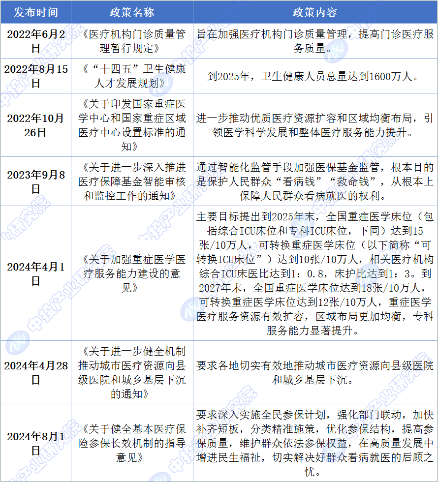 2024年4月1日,国家卫生健康委等八个部门联合发布《关于加强重症医学医疗服务能力建设的意见》,主要目标提出到2025年末,全国重症医学床位(包括综合ICU床位和专科ICU床位,下同)达到15张/10万人,可转换重症医学床位(以下简称“可转换ICU床位”)达到10张/10万人,相关医疗机构综合ICU床医比达到1:0.8,床护比达到1:3。到2027年末,全国重症医学床位达到18张/10万人,可转换重症医学床位达到12张/10万人,重症医学医疗服务资源有效扩容,区域布局更加均衡,专科服务能力显著提升。2024年4月28日,国家卫生健康委、国家中医药局、国家疾控局发布《关于进一步健全机制推动城市医疗资源向县级医院和城乡基层下沉的通知》,要求各地切实有效地推动城市医疗资源向县级医院和城乡基层下沉。2024年8月1日,国务院办公厅发布《关于健全基本医疗保险参保长效机制的指导意见》,要求深入实施全民参保计划,强化部门联动,加快补齐短板,分类精准施策,优化参保结构,提高参保质量,维护群众依法参保权益,在高质量发展中增进民生福祉,切实解决好群众看病就医的后顾之忧。