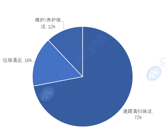 在当前阶段,国内环卫服务市场主要分为道路清扫保洁、垃圾清运和维护保洁三部分,其中最主要的为道路清扫保洁,占比超过一半,达到72%;其次是垃圾清运,占比达到16%;最后为日常维护和养护保洁,占比达到12%。