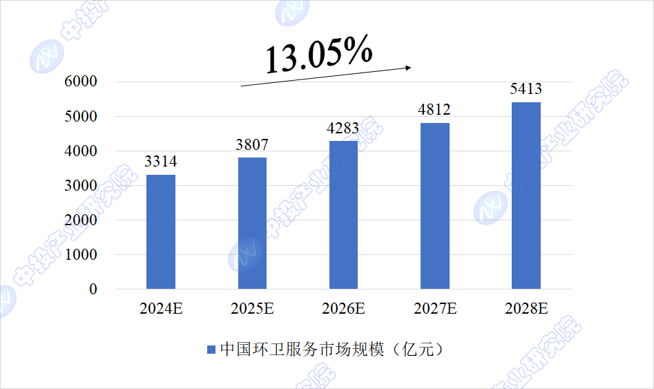 2022年,我国环卫服务市场规模大约达到2,514亿元;2023年,我国环卫服务市场规模大约达到2,907亿元。中投产业研究院预计,2024年我国环卫服务市场规模将达到3,314亿元,未来五年(2024-2028)年均复合增长率约为13.05%,2028年将达到5,413亿元。