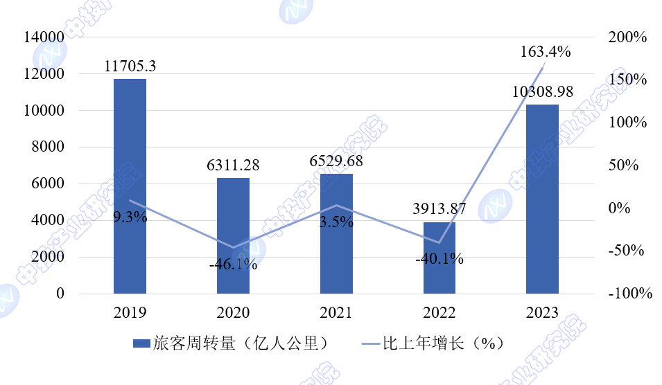 全行业完成旅客周转量10308.98亿人公里,比上年增长163.4%。国内航线完成旅客周转量9079.46亿人公里,比上年增长138.6%,其中,港澳台航线完成93.55亿人公里,比上年增长1336.2%;国际航线完成旅客周转量1229.52亿人公里,比上年增长1029.4%。