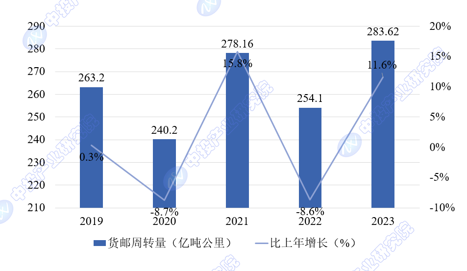 全行业完成货邮周转量283.62亿吨公里,比上年增长11.6%。国内航线完成货邮周转量70.47亿吨公里,比上年增长34.7%,其中,港澳台航线完成1.84亿吨公里,比上年增长6.4%;国际航线完成货邮周转量213.15亿吨公里,比上年增长5.6%。