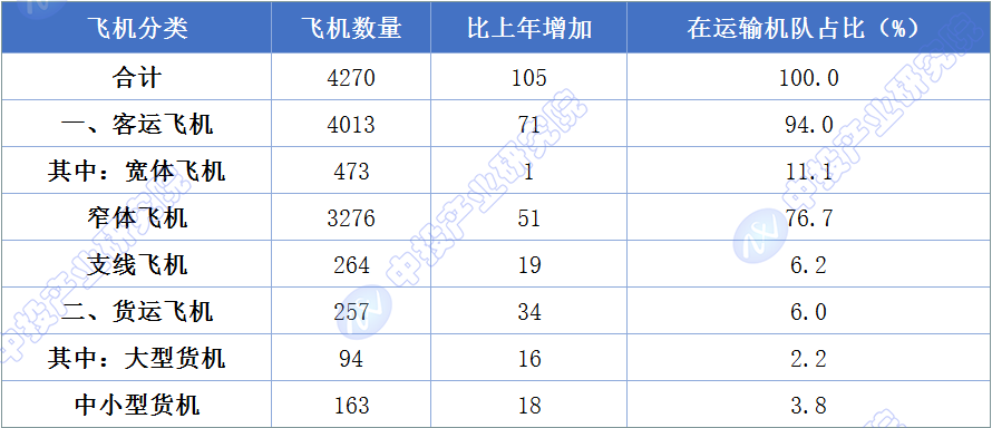 截至2023年底,民航全行业运输飞机期末在册架数4270架,比上年底增加105架。
