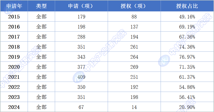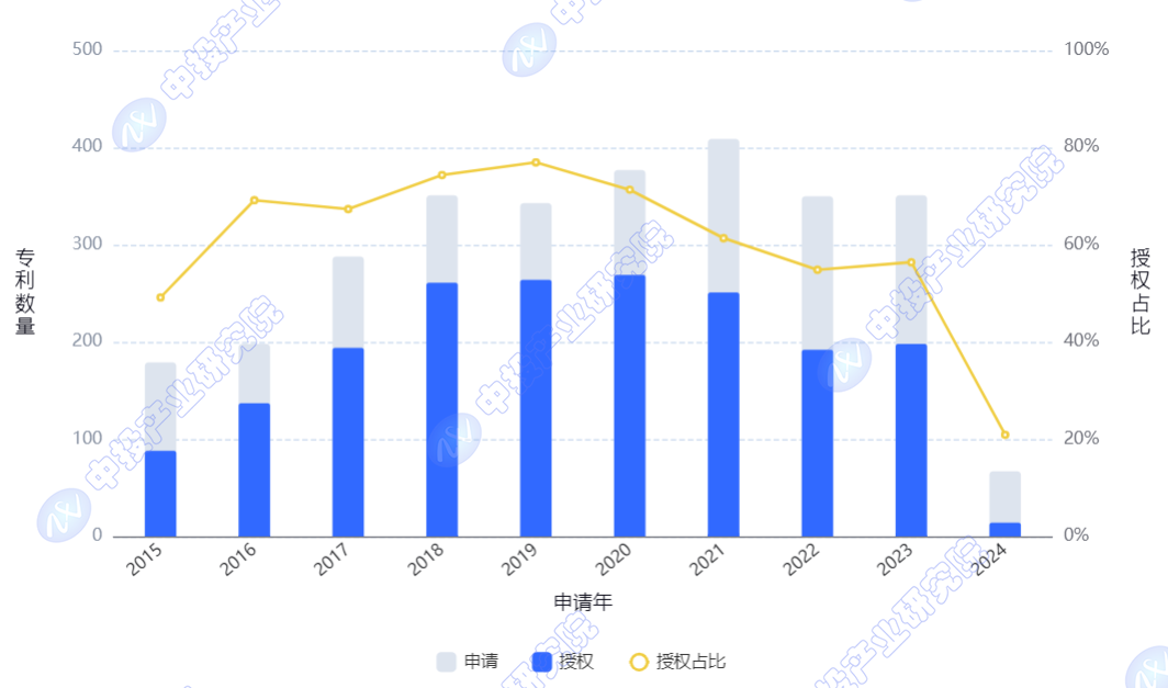 展示该技术领域逐年公开的专利申请量、授权量及对应授权率(当年申请的专利授权量/当年申请量)。申请量较多的年份为该技术领域热度较高的年份,申请趋势上升可以反映该技术领域研发投入呈上升趋势。由于发明授权的周期长,专利公开具有延后性,因此近2-3年的申请量和授权率可能偏低。