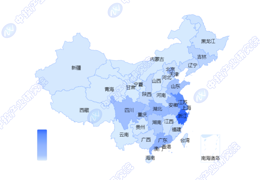 示该技术领域在中国各省市的专利申请量分布。申请量较大的区域,该地区通常有相关技术集群,相关技术的研究较为先进。颜色越深表明申请量越多,鼠标定位到右侧,颜色条会显示对应的申请量,地图中相应申请量的区域也会高亮。