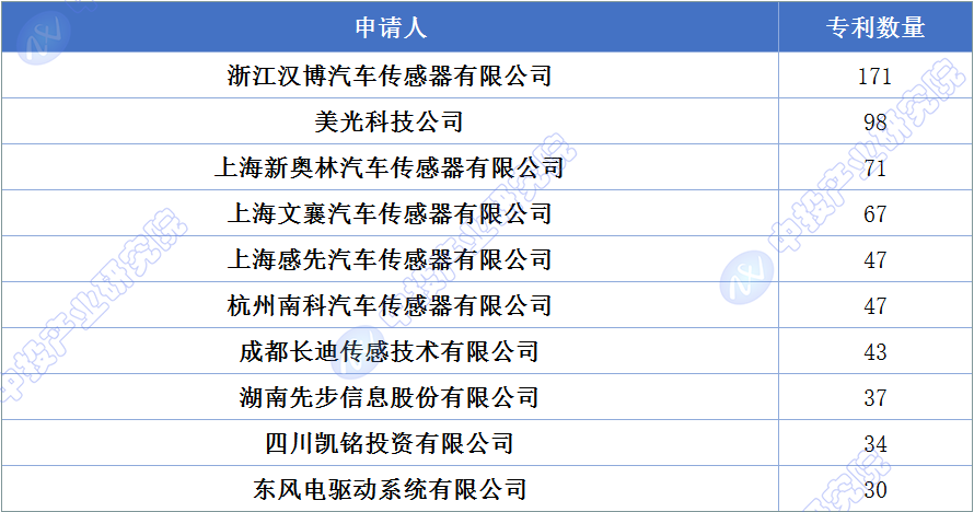 图表:截至2024年中国汽车传感器相关专利申请人排名TOP10
