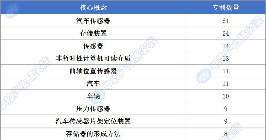 图表:截至2024年中国汽车传感器相关专利申请热点排名TOP10