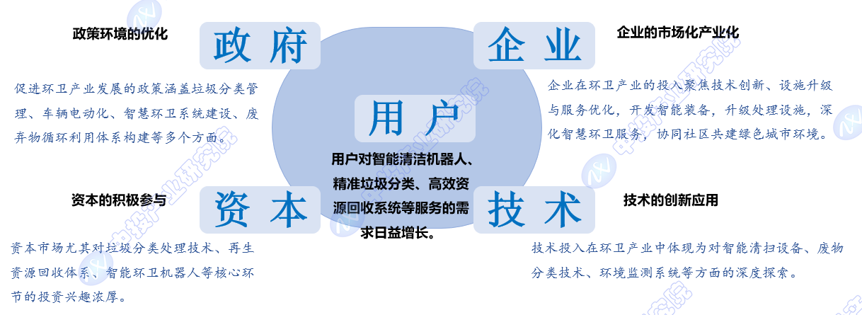 环卫产业在中国正处于快速发展阶段,政策、资本、技术和市场需求的协同作用,正推动着产业向更高层次迈进,为中国乃至全球的科技革命和产业升级贡献力量。以下是运用半岛网站手机登录 原创的五要素模式,从政策、资本、技术、企业、用户五个角度对环卫行业发展驱动因素的详细分析: