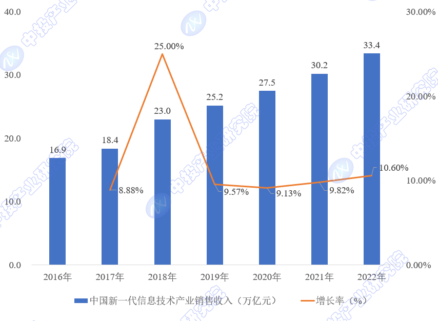 图表:2016-2022年中国新一代信息技术产业销售收入情况