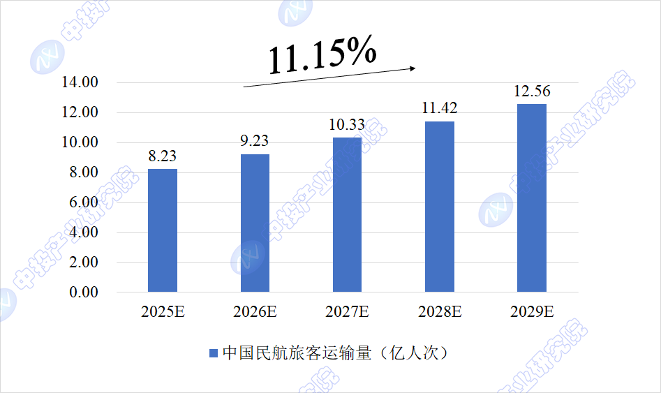 中投产业研究院预计,2025年中国民航旅客运输量将达到8.23亿人次,未来五年(2025-2029)年均复合增长率约为11.15%,2029年将达到12.56亿人次。