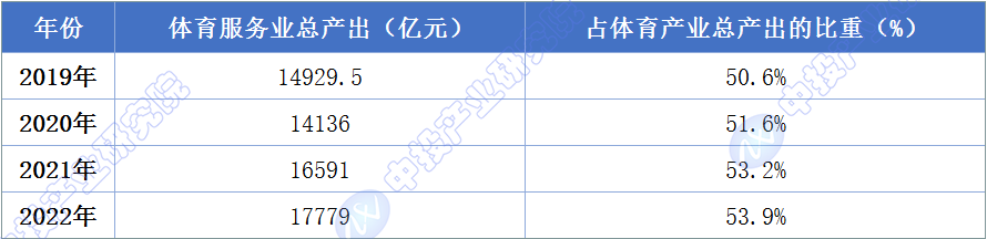 图表:2019-2022年中国体育服务业总产出及占体育产业总产出的比重