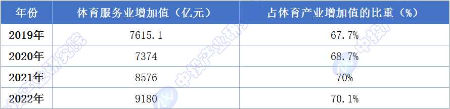 图表:2019-2022年中国体育服务业增加值及占体育产业增加值的比重