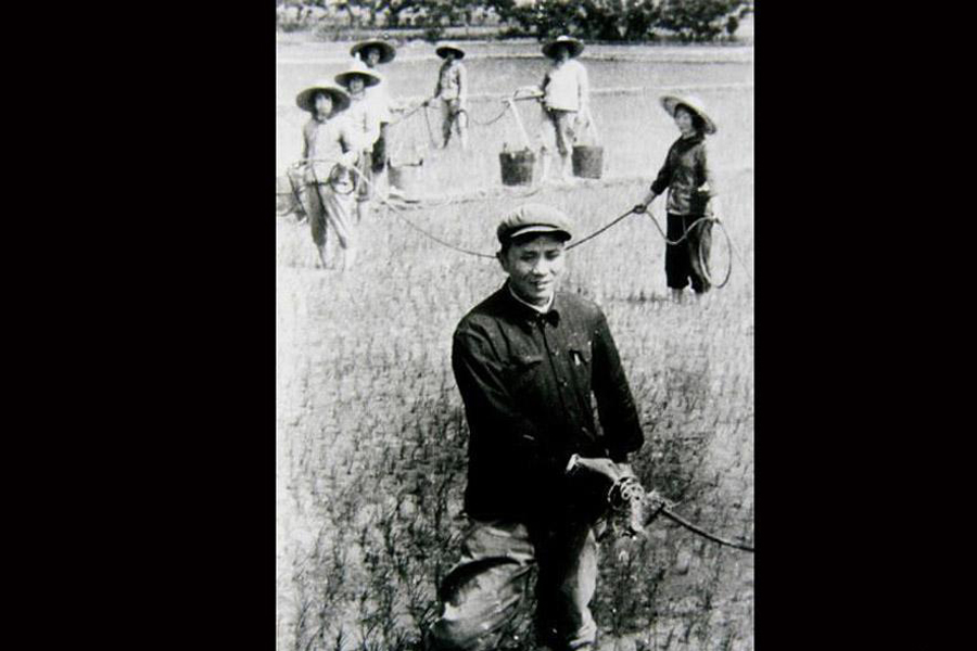 图为1968年9月,华西村书记吴仁宝在田间治虫。