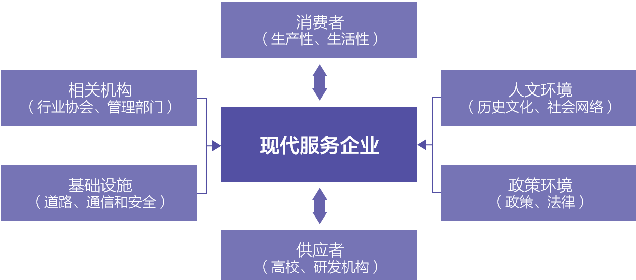 现代服务业集群是现代服务业企业及其关联机构在地理空间上的聚集体,除现代服务企业、供应者和消费者外,还应包括集群所在地基础设施、人文环境、政策环境等