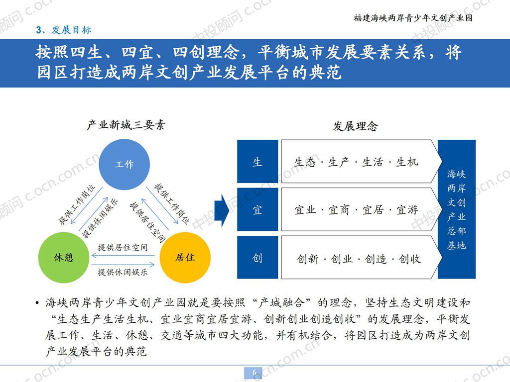 在工业化和城镇化高速发展的进程中,中国多地各种新城建设突飞猛进。然而,在新城建设“大干快上”的背景下,却出现了诸如“睡城”、“鬼城”和“空城”等问题。出现“睡城”的原因在于有人气无产业,出现“鬼城”、“空城”的原因则是无人气也无产业。 没有产业就没有就业,就没有城市的发展;而有人才能把产业支撑起来。没有产业的支撑,城市发展得再好,也只是“空城”;产业如果没有城市为依托,即使结构再合理、再高端,也只能是空转。 为解决这道难题,海峡青少年文创产业园注重产业和城市功能的联动,建设集生产、生活、生态、生机于一体的文创产业新城,这种产业新城不仅解决了睡城、鬼城的问题,而且极具生命力。 据此,项目主体建设框架为两区、三园、六中心:两区:产业聚集区、居住集中区;三园:文教园、文创园、文旅园;六中心:教育辅导中心、艺术培养中心、旅游体验中心、展览展示中心、创业孵化中心和商业服务中心。
