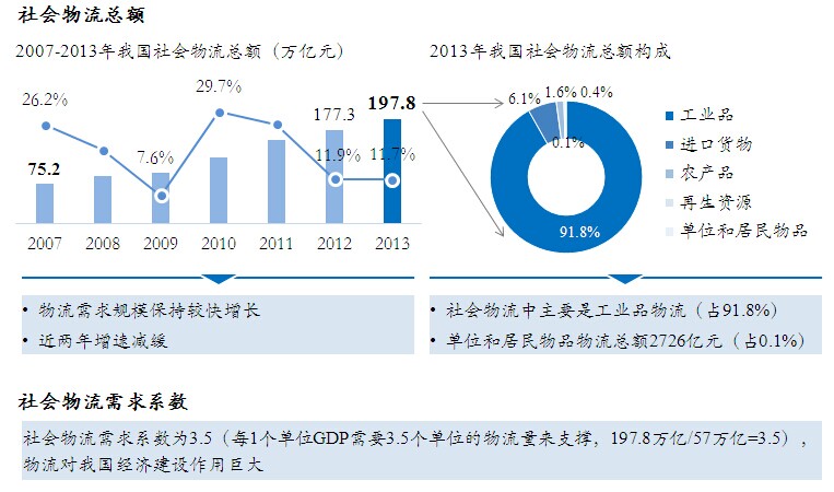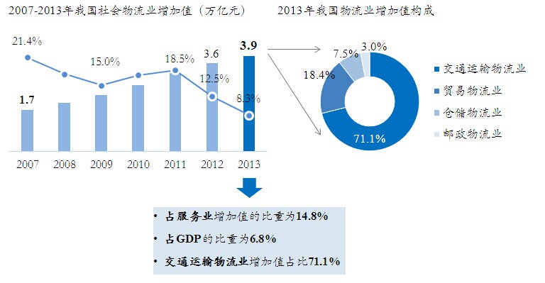 ● 2013年我国物流业增加值3.9万亿,占服务业增加值的14.8%,其中交通运输物流占物流增加值比重超过70%。