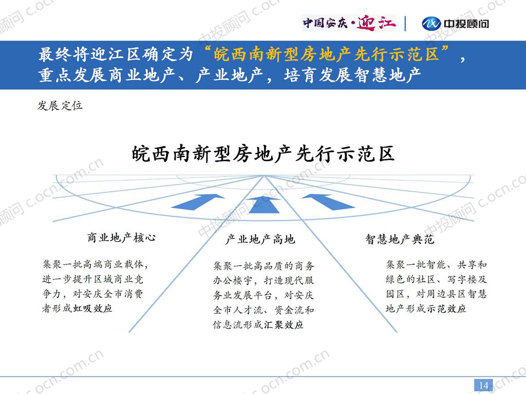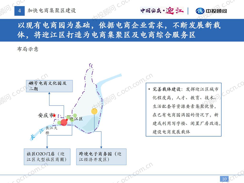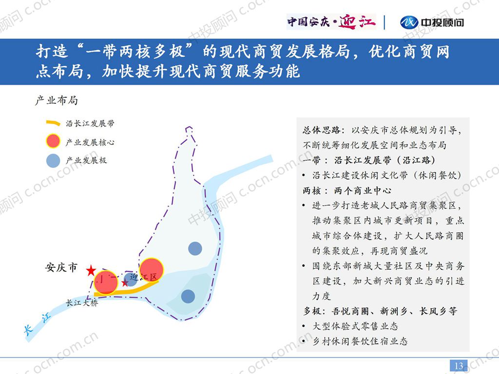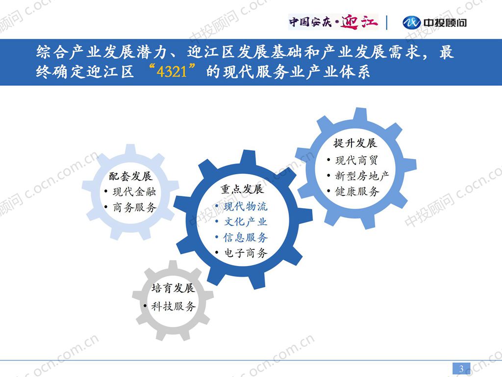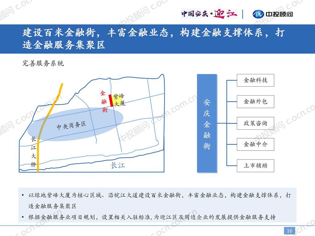 规划内容:立足迎江区现有基础、把握产业发展环境和趋势,紧紧围绕“五个迎江”的发展要求,将迎江区打造成为安庆市高品质消费中心、皖西南现代服务业高地和和长三角休闲后花园,重点发展现代物流、文化产业、信息服务及电子商务,提升发展现代商贸、健康服务、新型房地产,配套发展现代金融、商务服务,培育发展科技服务,形成迎江区“4321”的现代服务业产业体系