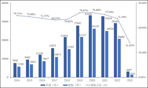 展示该技术领域逐年公开的专利申请量、授权量及对应授权率(当年申请的专利授权量/当年申请量)。申请量较多的年份为该技术领域热度较高的年份,申请趋势上升可以反映该技术领域研发投入呈上升趋势。由于发明授权的周期长,专利公开具有延后性,因此近2-3年的申请量和授权率可能偏低。