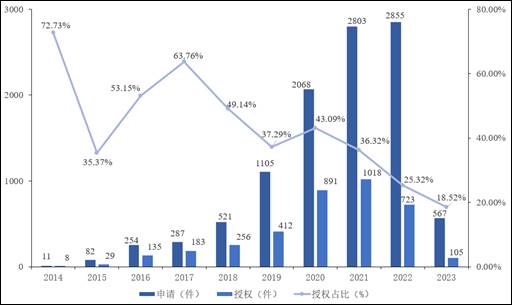展示该技术领域逐年公开的专利申请量、授权量及对应授权率(当年申请的专利授权量/当年申请量)。申请量较多的年份为该技术领域热度较高的年份,申请趋势上升可以反映该技术领域研发投入呈上升趋势。由于发明授权的周期长,专利公开具有延后性,因此近2-3年的申请量和授权率可能偏低。
