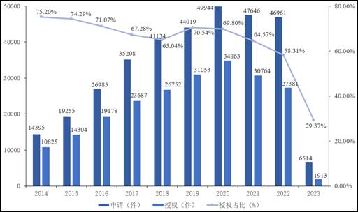 展示该技术领域逐年公开的专利申请量、授权量及对应授权率(当年申请的专利授权量/当年申请量)。申请量较多的年份为该技术领域热度较高的年份,申请趋势上升可以反映该技术领域研发投入呈上升趋势。由于发明授权的周期长,专利公开具有延后性,因此近2-3年的申请量和授权率可能偏低。