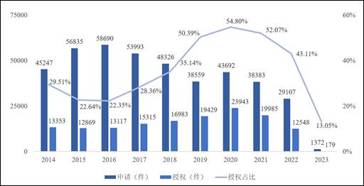 专利趋势展示该技术领域逐年公开的专利申请量、授权量及对应授权率(当年申请的专利授权量/当年申请量)。申请量较多的年份为该技术领域热度较高的年份,申请趋势上升可以反映该技术领域研发投入呈上升趋势。由于发明授权的周期长,专利公开具有延后性,因此近2-3年的申请量和授权率可能偏低。