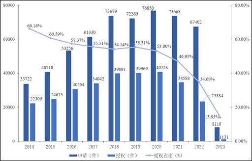 展示该技术领域逐年公开的专利申请量、授权量及对应授权率(当年申请的专利授权量/当年申请量)。申请量较多的年份为该技术领域热度较高的年份,申请趋势上升可以反映该技术领域研发投入呈上升趋势。由于发明授权的周期长,专利公开具有延后性,因此近2-3年的申请量和授权率可能偏低。