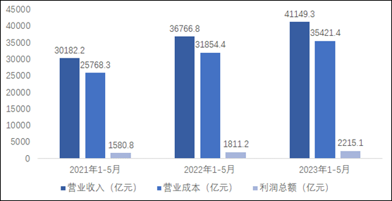2023年1-5月,全国电气机械和器材制造业营业收入41149.3亿元,同比增长15.1%;营业成本35421.4亿元,同比增长14.3%;利润总额2215.1亿元,同比增长29.2%。