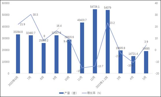 2023年5月,全国电动手提式工具当月产量与2022年同期相比下降。2023年5月全国电动手提式工具产量为1484.32万台,同比下降14.5%。2023年1-5月全国电动手提式工具产量为6851.41万台,同比下降19.5%。