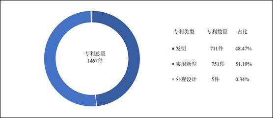展示该技术领域的专利类型分布,发明和实用新型是功能、结构上的创新,外观设计是对产品外观的创新。一般发明占比越高,则创新程度越高;实用新型侧重产品的小改进;产品种类多、更新换代快的行业外观设计偏多。